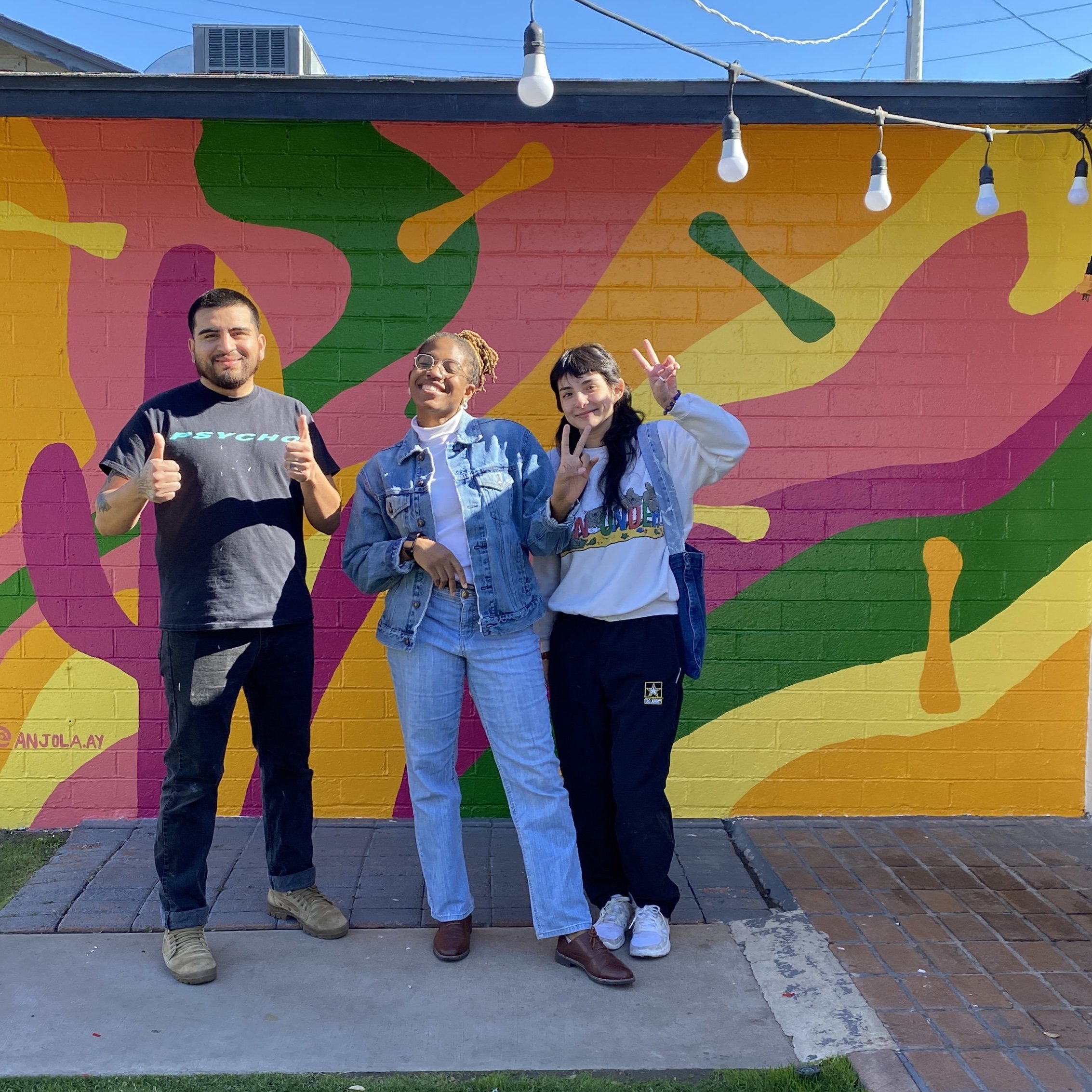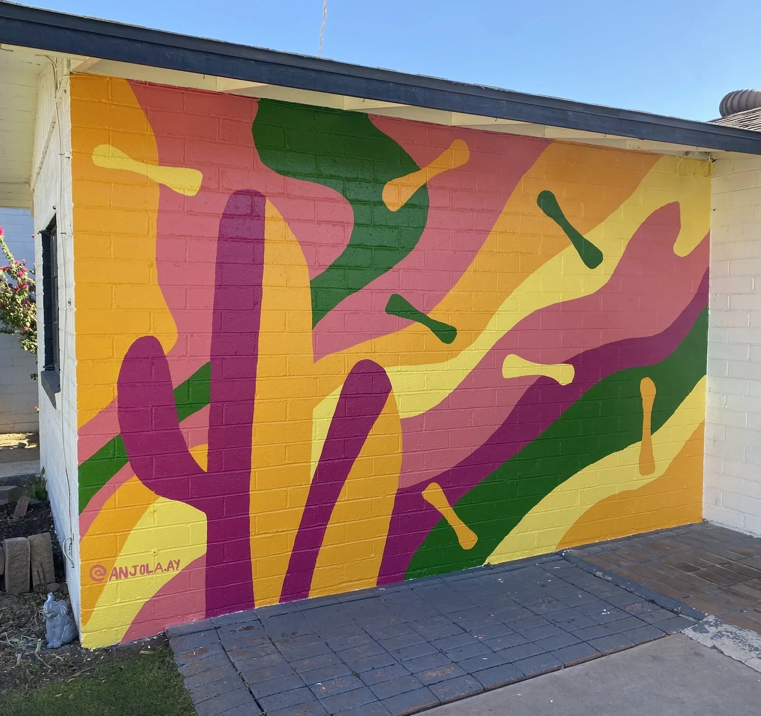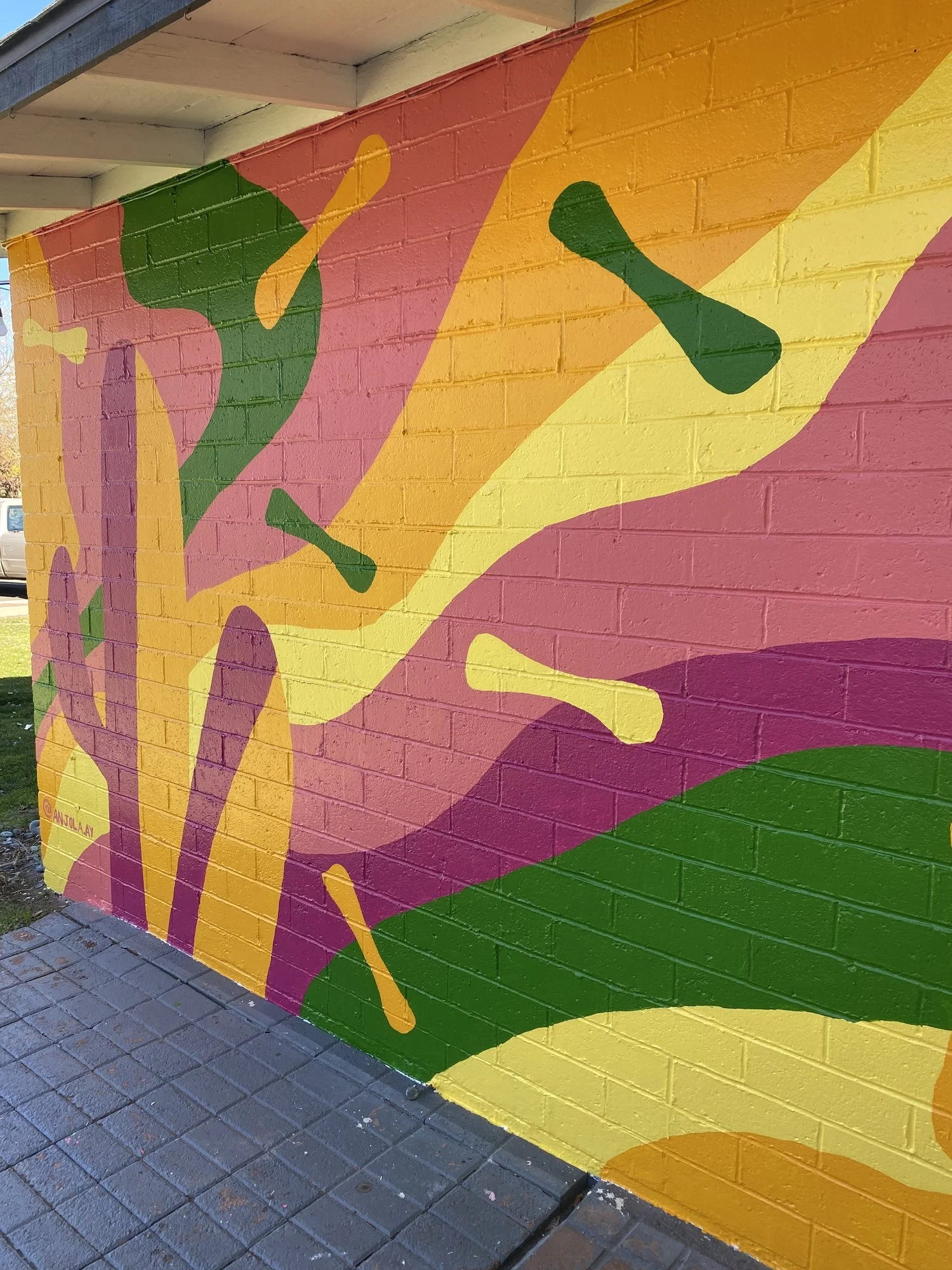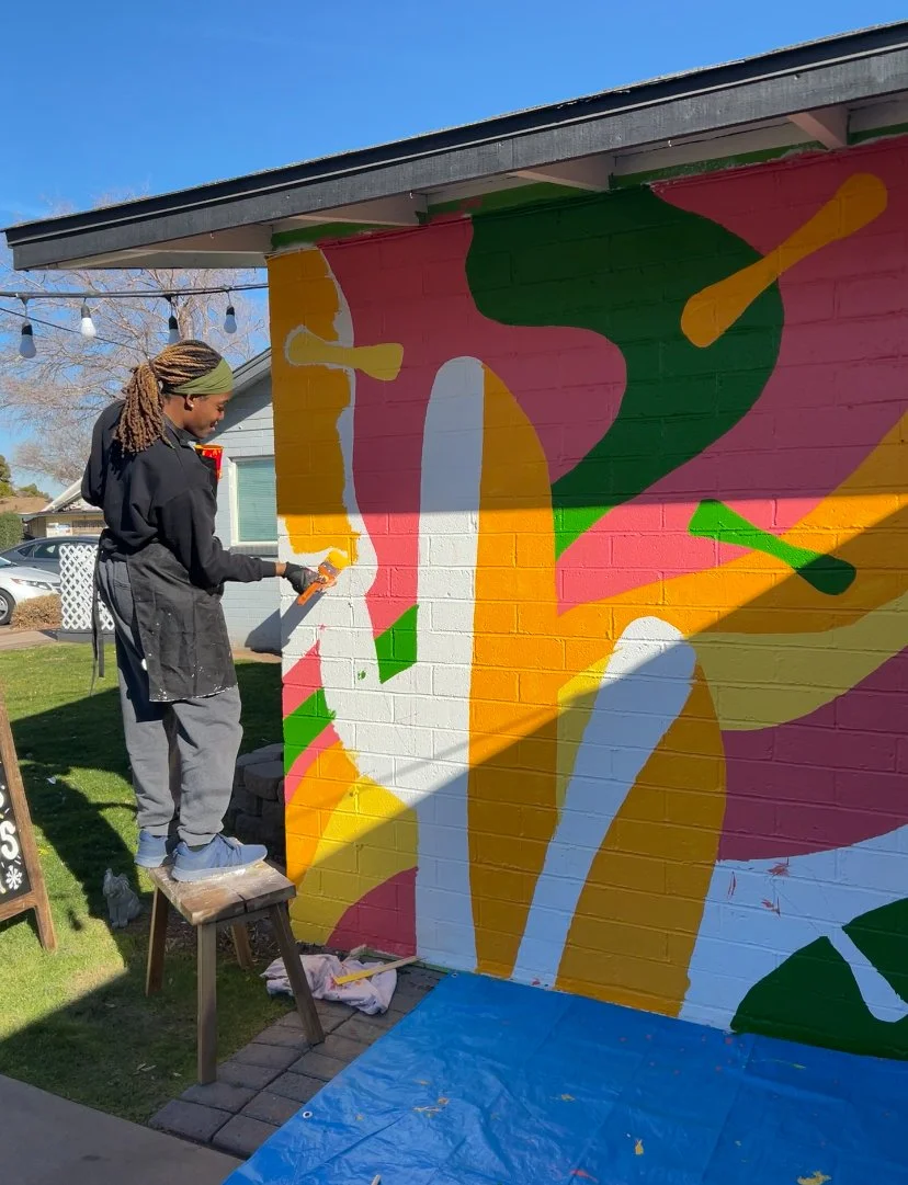 A 93 sq. ft. exterior vibrant painted mural on Brick textured wall outside a small business studio space.